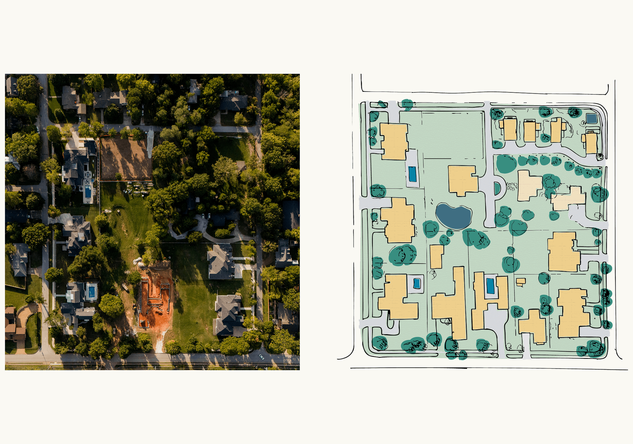 The redevelopment includes seven estate homes and six cottages. The estates are situated on ½ acre size lots creating spacial living with the downtown accessibility. These homes are 4,000-5,000 square feet with options to include attached ADUs, pools, gardens, and sport courts. The Cottages located on the western side of the property are designed as a cottage court with shared outdoor living areas. These homes 2000-2500 square feet are designed with different flex space options like studios, home gyms, and offices on the ground floors.